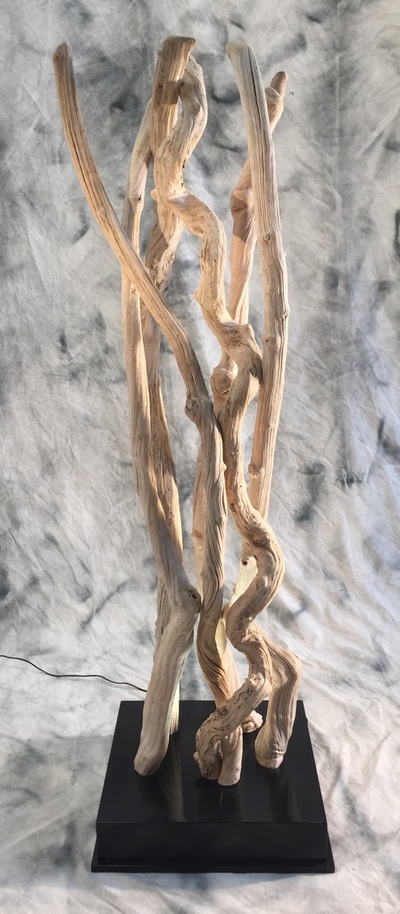 Cette colonne est constituée de plusieurs lianes guimauves de 5/7cm de diamètre afin de former une véritable sculpture. un socle en bois recouvert d'une peinture polyuréthane noire. il fait environ 50cm par 50cm.Un spot leds est fixé dedans afin d'éclairer les lianes. hauteur 2m20 environ