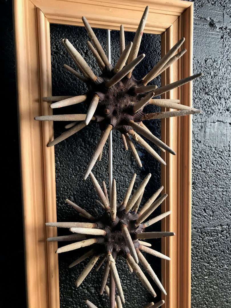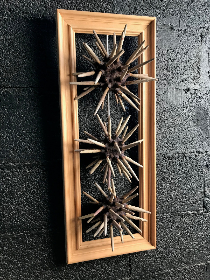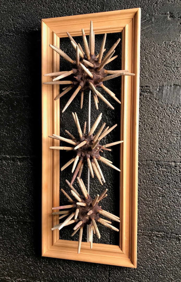 3 oursins crayons sont assemblés sur une tige en aluminium et encadrée