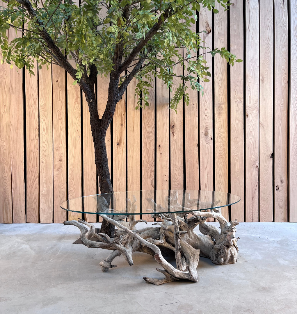 Un plateau en verre repose sur cette souche en racine Africaine.