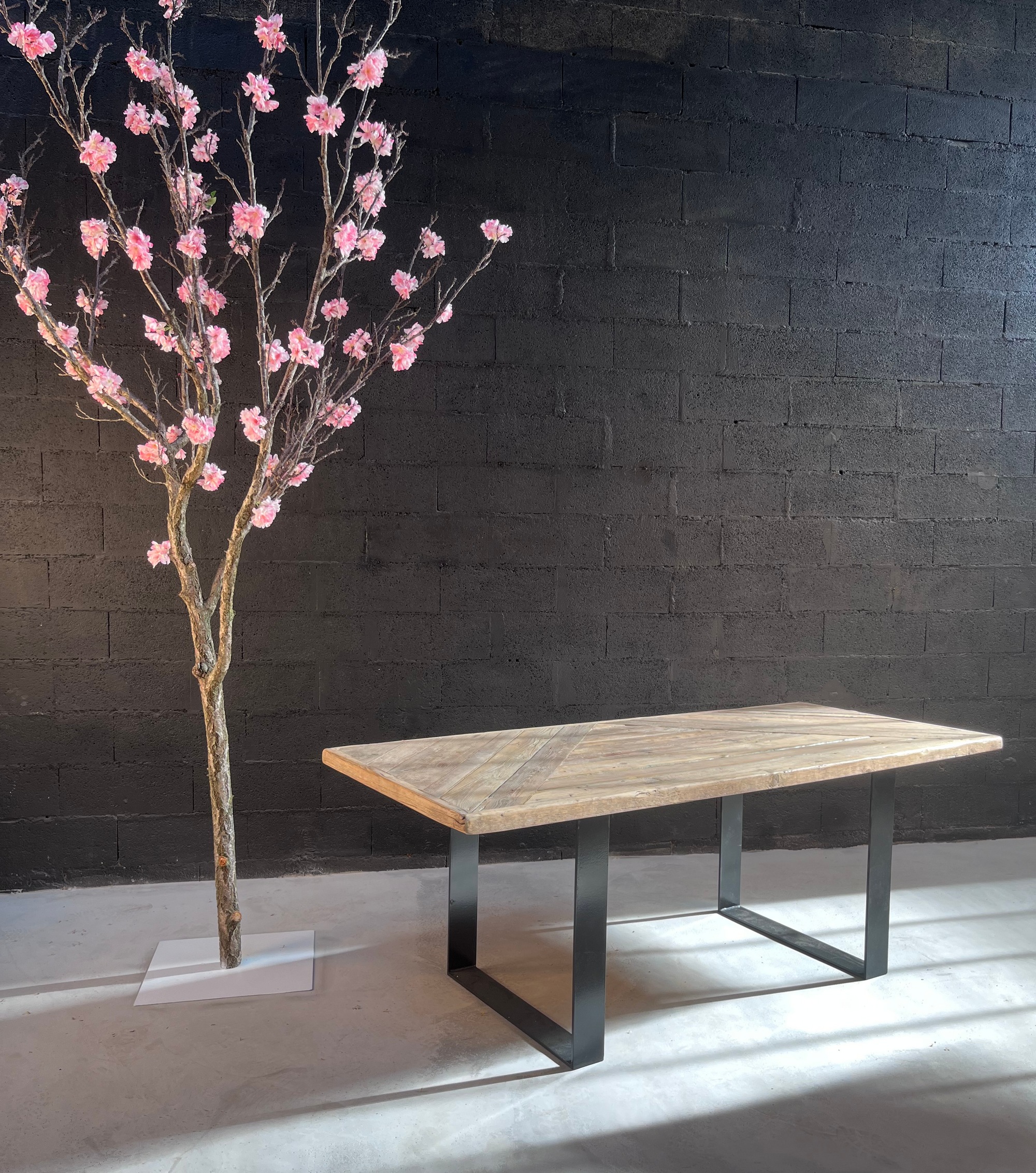 Cette table est construite à partir de véritables planches de bois flotté , vieillies et polies par les flots et assemblées façon marqueterie.