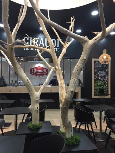 3 dead trees serve as central decoration for a stall. Made in partnership with the Wenes Group.