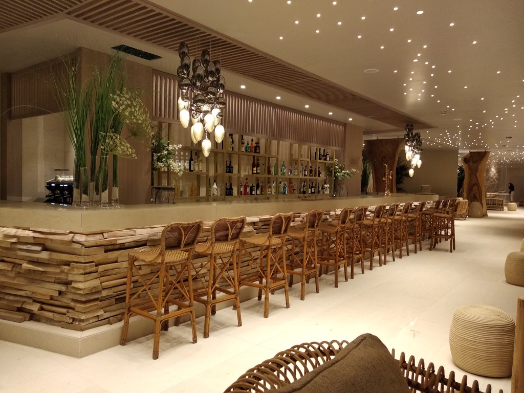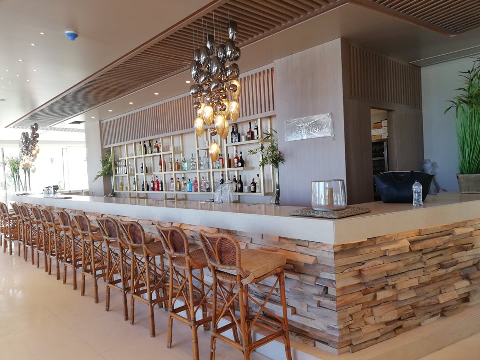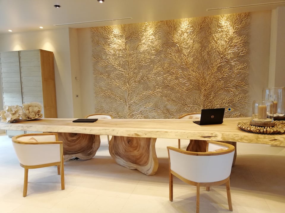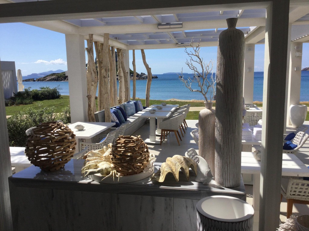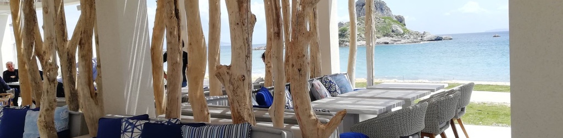 Une centaine de troncs en bois flotté de 3m50 de hauteur en 15cm de diamètre pour servir de brise vue dans le séjour et la salle de restaurant ainsi que des souches de bois flotté pour cette hotel 5 étoiles à Ikos en Grèce.