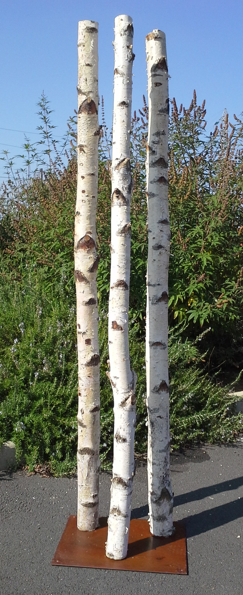3 troncs de bouleau, de 2m de hauteur et d'un diamètre de 10cm, viennent s'emboiter sur un socle en acier rouillé et vernis de 40cmX 50cm.