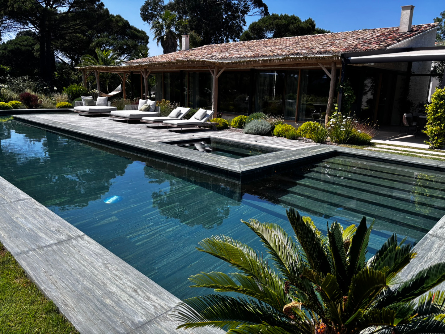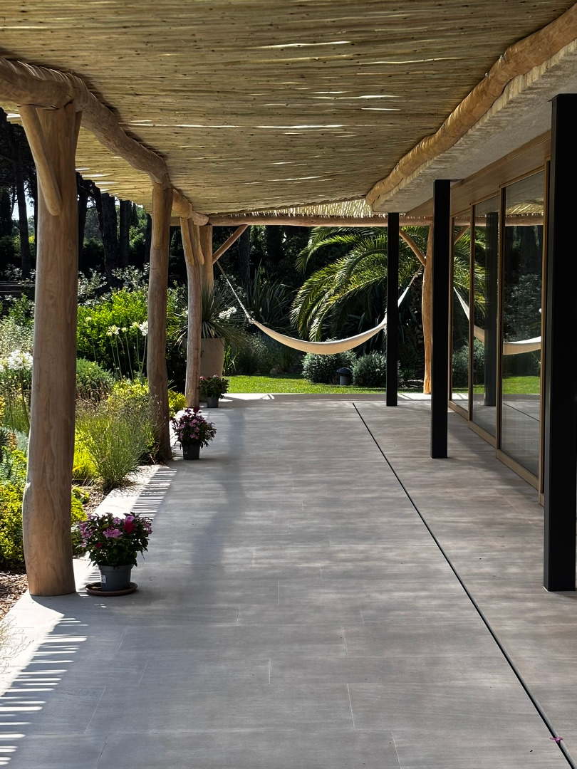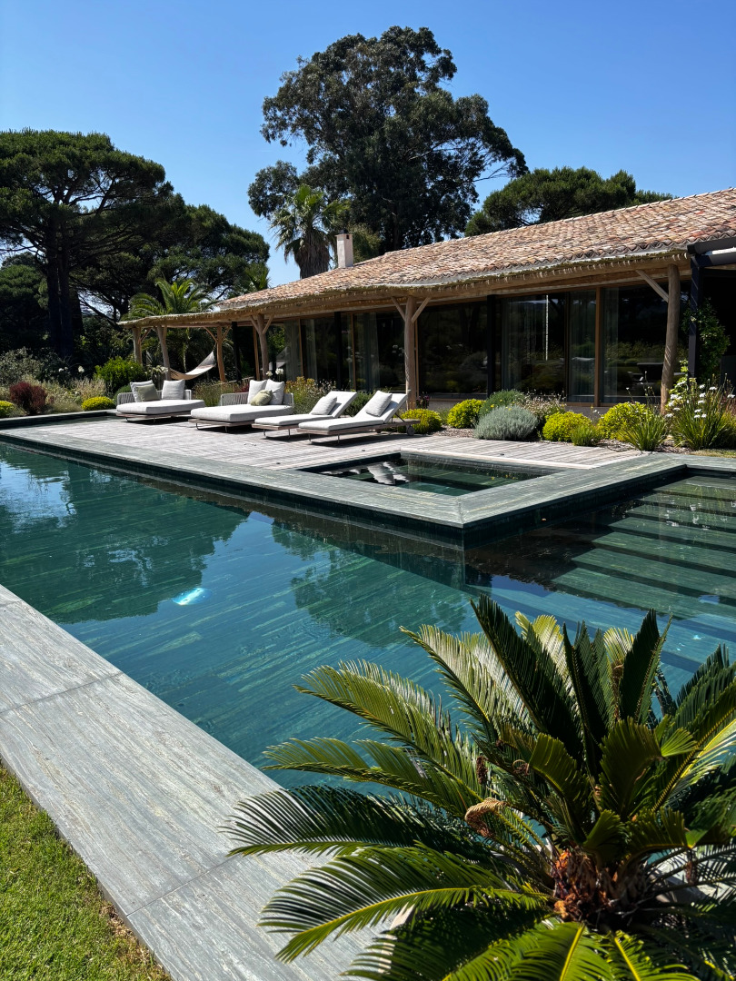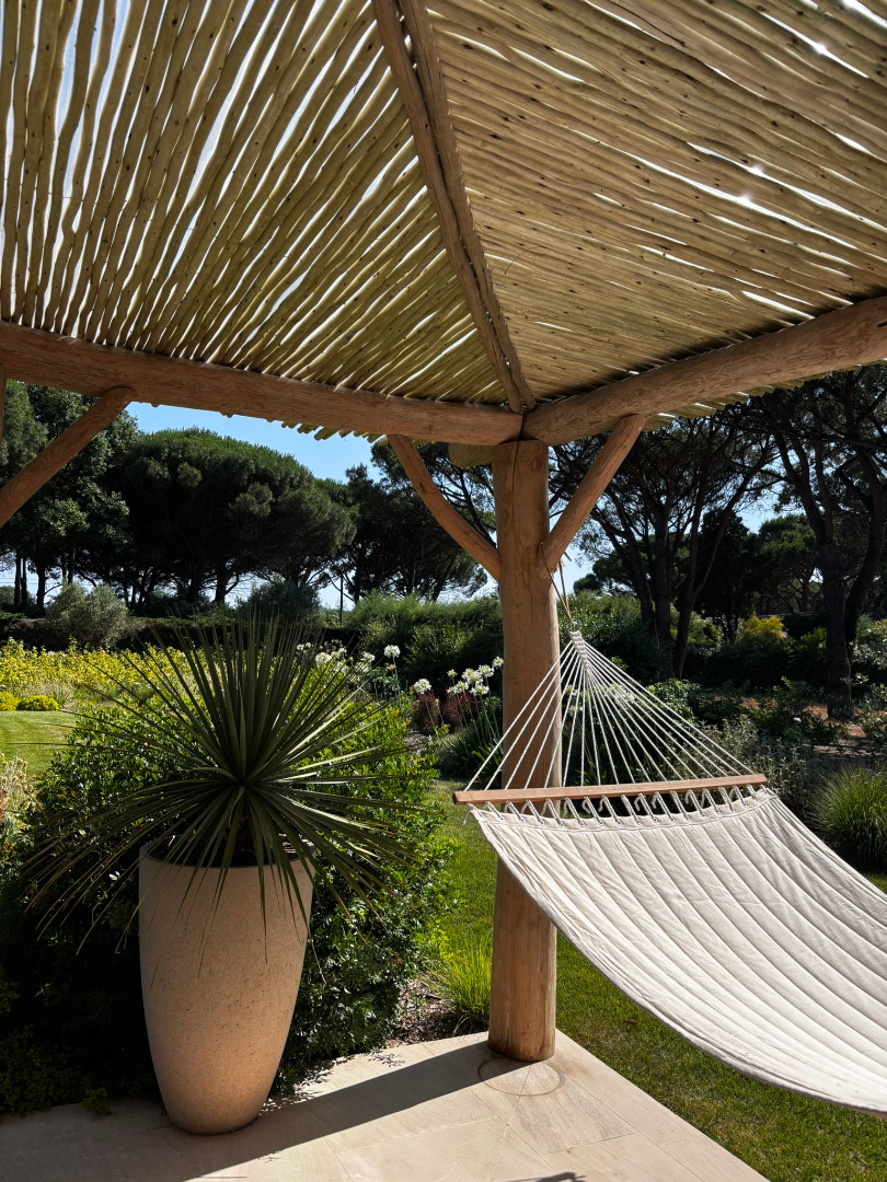 Elle vient offrir un coin ombragé pour se rafraîchir face à une splendide piscine.