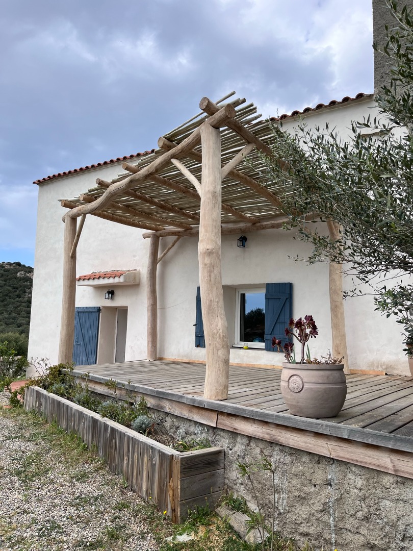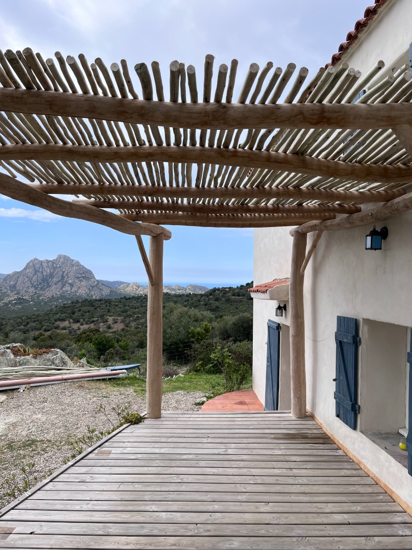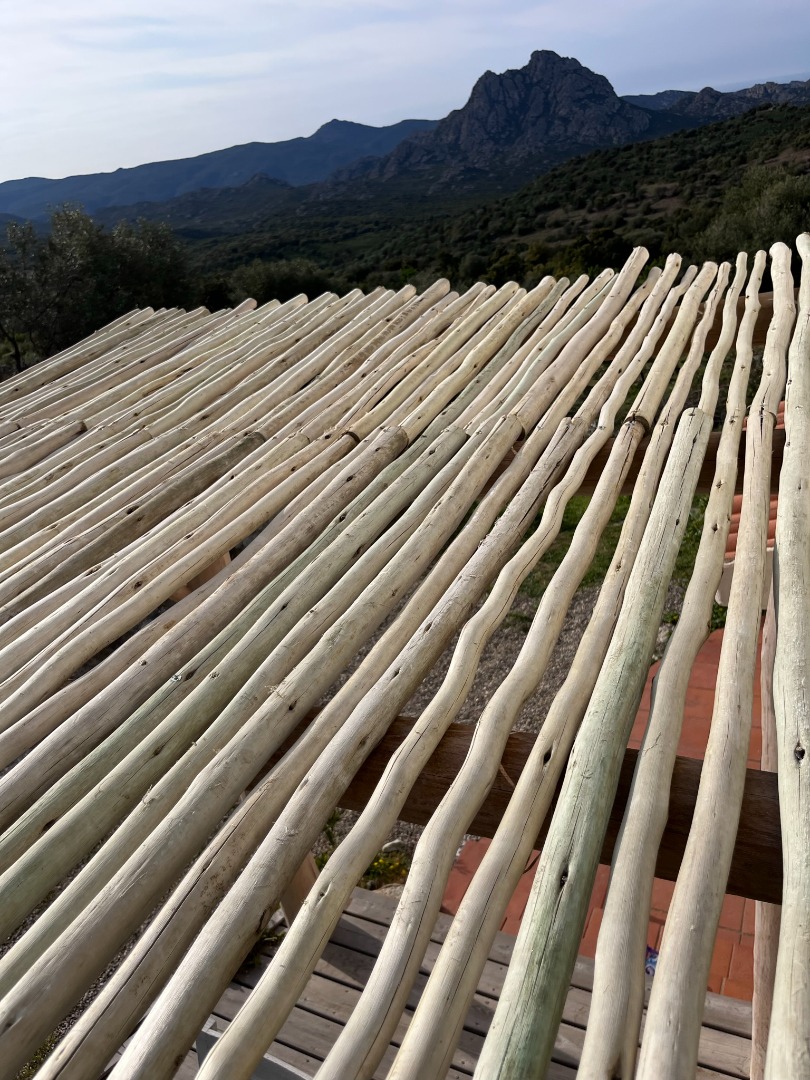 Cette pergola en bois flotté est une véritable invitation à la contemplation. Chaque pièce de bois, façonnée par le temps et les éléments, raconte une histoire unique. Placée face à la montagne, elle devient un cadre majestueux qui relie l’authenticité des matériaux à la grandeur du paysage.