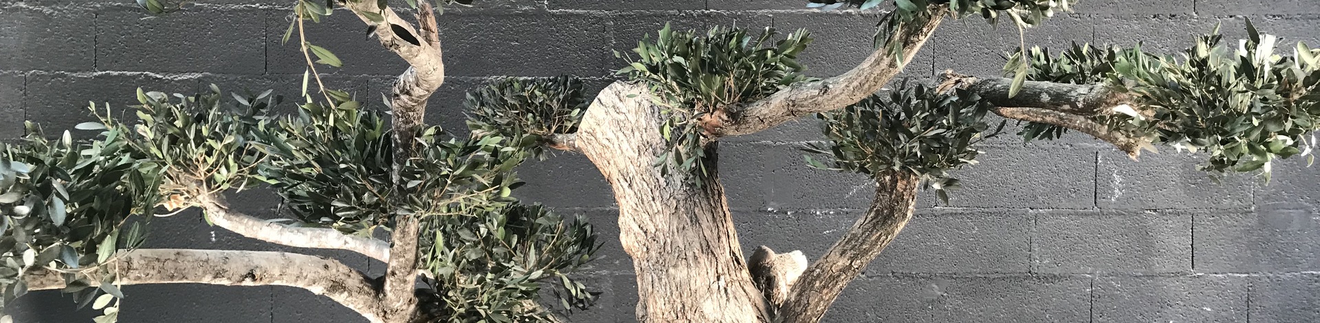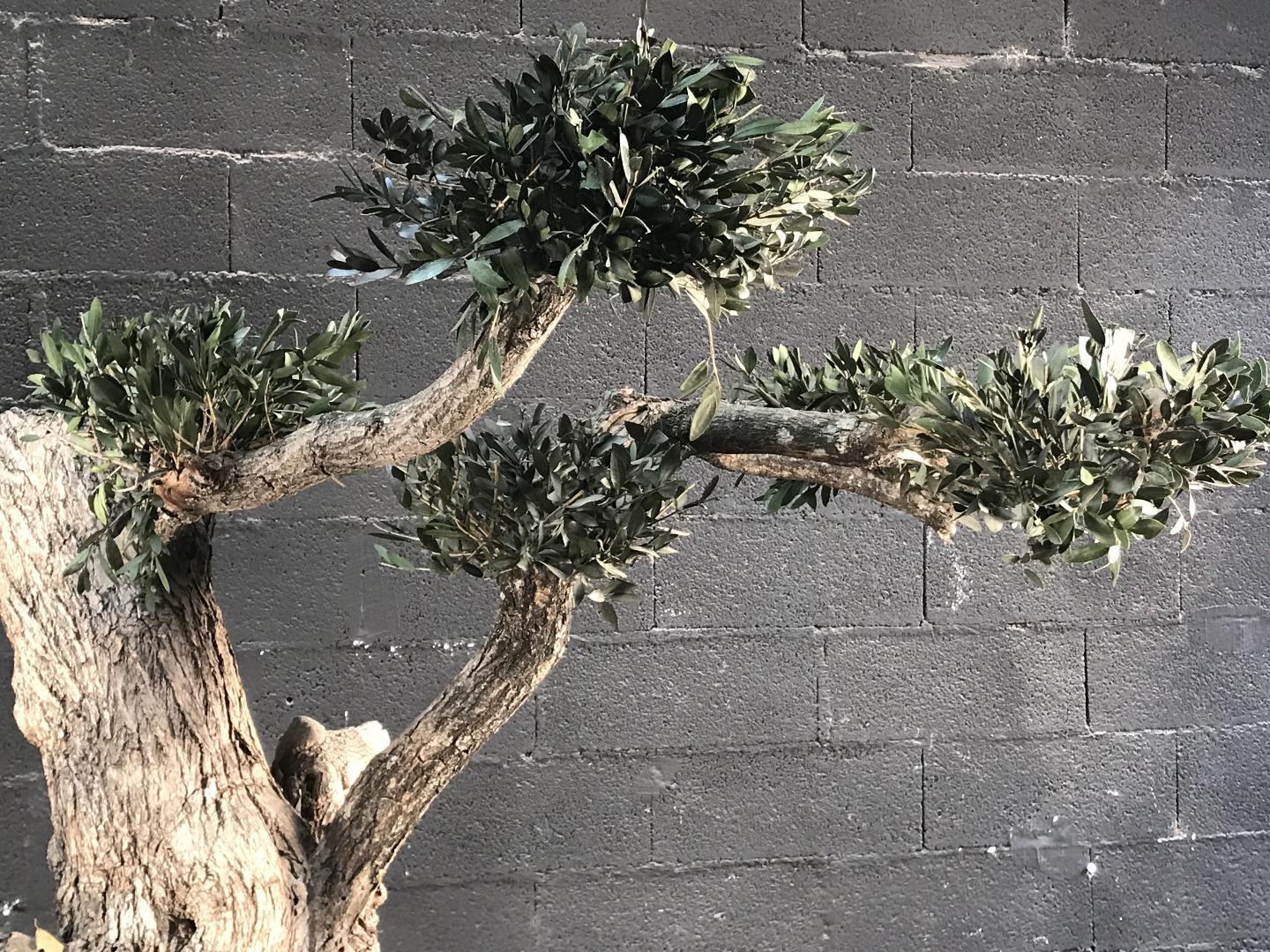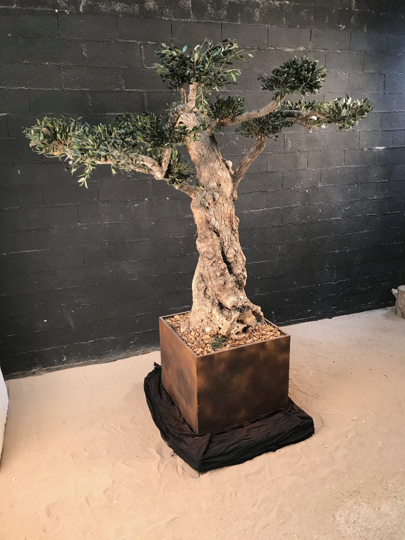 Des branches ont été greffés sur le tronc afin de lui donner la forme "bonzaï" et ensuite nous avons greffés des branches d'olivier et taillé pour lui donner la forme "Niwaki"