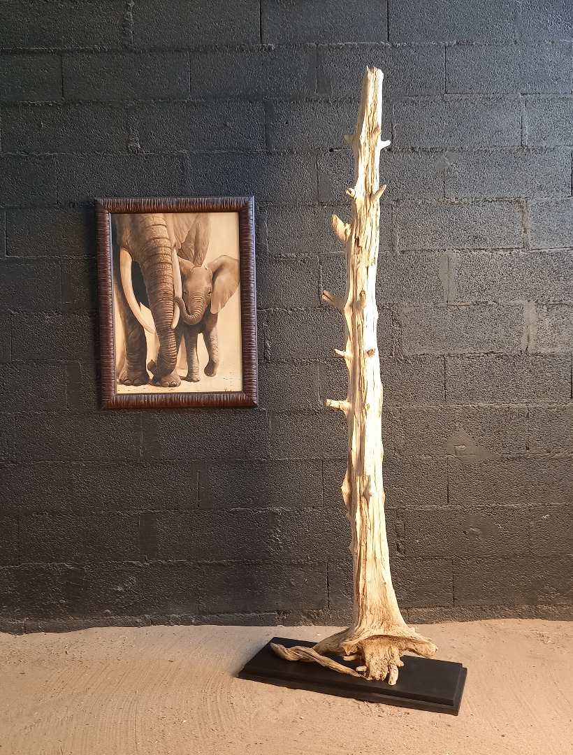 Sculpture en bois flotté mesurant 1m 90 de hauteur et ayant pour diamètre 15cm pour le tronc. Son socle mesure 74cm de longueur sur 30cm de largeur.