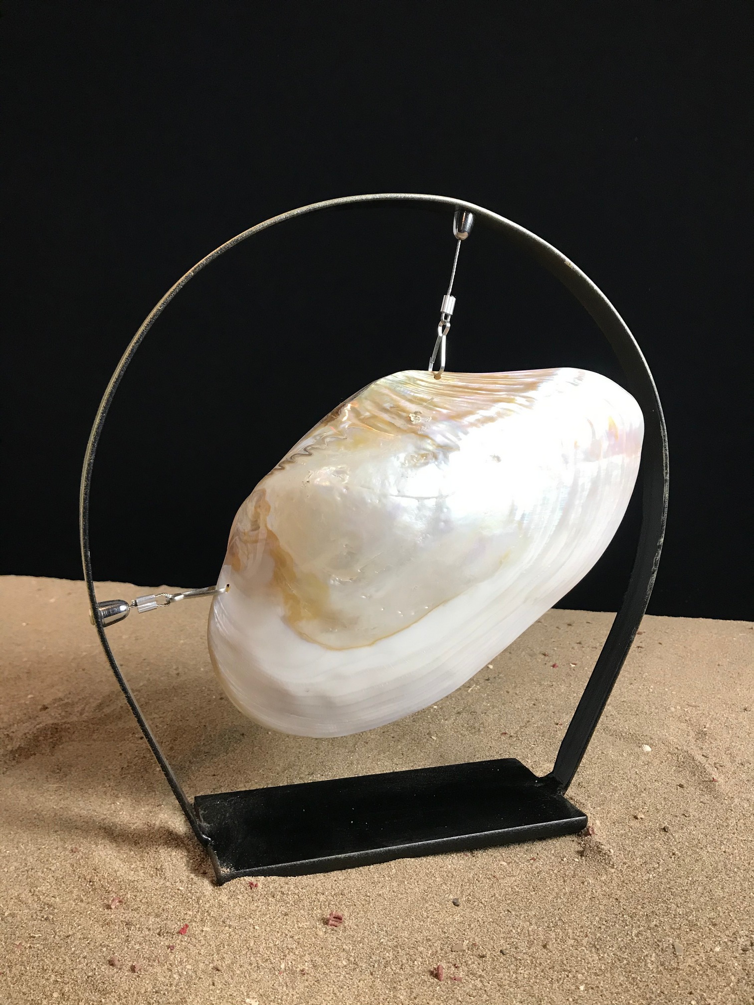 Cette moule chinoise nacrée est montée en suspension sur un socle en acier.